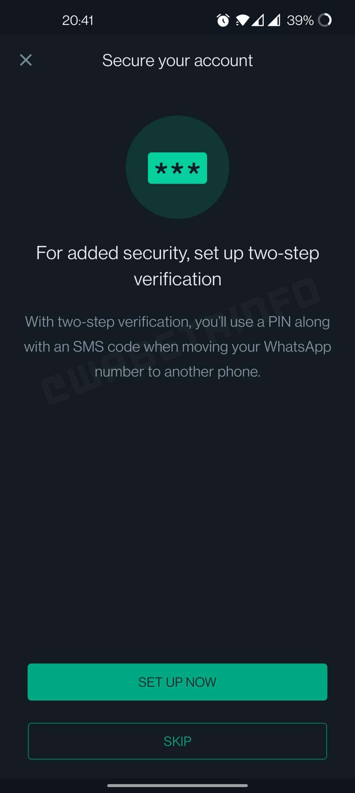 As you can see in this screenshot, this section is called "secure your account" and it recommends users enable two-step verification for added security. Note that with this section, WhatsApp won't force users to enable two-step verification since there is a skip button but it is very recommended to do it. If you already want to enable two-step verification, please open WhatsApp Settings > Account > Two-step verification.